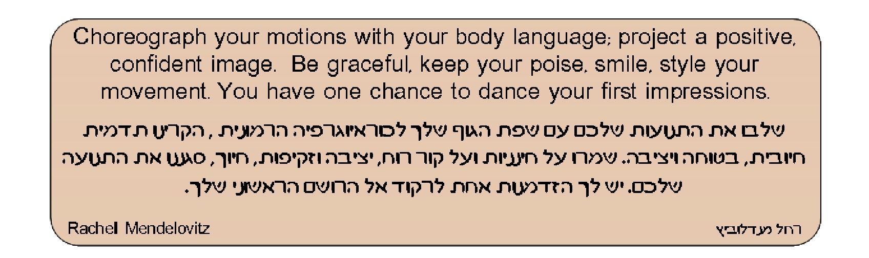 אנחנו מכירים את המשפט – ישנה הזדמנות אחת לעשות רושם ראשוני חיובי. לכן חשוב להיות מודעים לתדמית האישית, למסר אותו ברצונך להעביר, לעמידה, ליציבה, למסר הבלתי מילולי המועבר על ידי התנועות ושפת הגוף שלך.